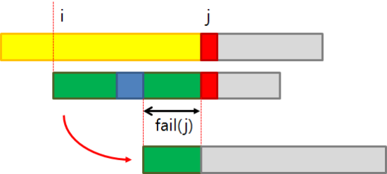 그 후, 위 그림과 같이 불일치가 발생하였을 때마다, fail에 해당하는 값만큼 건너뛰어, i는 절대 감소하지 않고, j만 이동하도록 만들어 주면 시간복잡도가 $O(N+M)$이 보장된다.