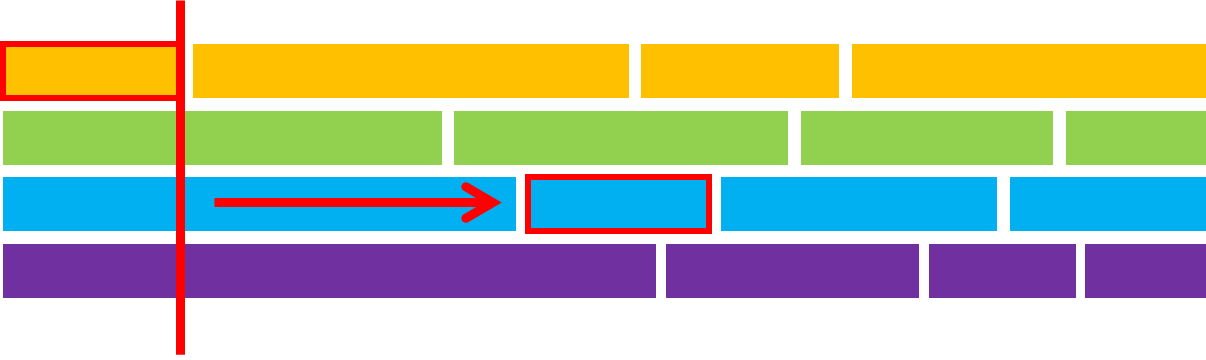 먼저 지금 아직 선택하지 않은 사람들 중 $i$번째 조각들을 끝나는 위치를 기준으로 정렬하고 생각하자. 그 중 가장 앞쪽의 (끝나는 위치가 가장 작은) 조각을 선택한다면, 그 다음 단계에서도 남은 조각들 중 끝나는 위치가 가장 작은 조각을 선택할 수 있음을 보이면 된다. 끝나는 위치가 가장 작은 조각을 제거하였으므로, 남은 사람들의 $i+1$번째 조각들의 시작점은 모두 방금 제거한 조각의 끝나는 위치보다 크거나 같기 때문에 다음에 선택한 조각과 방금 제거한 조각은 무조건 겹치지 않고, 조건을 만족하며 선택할 수 있다.